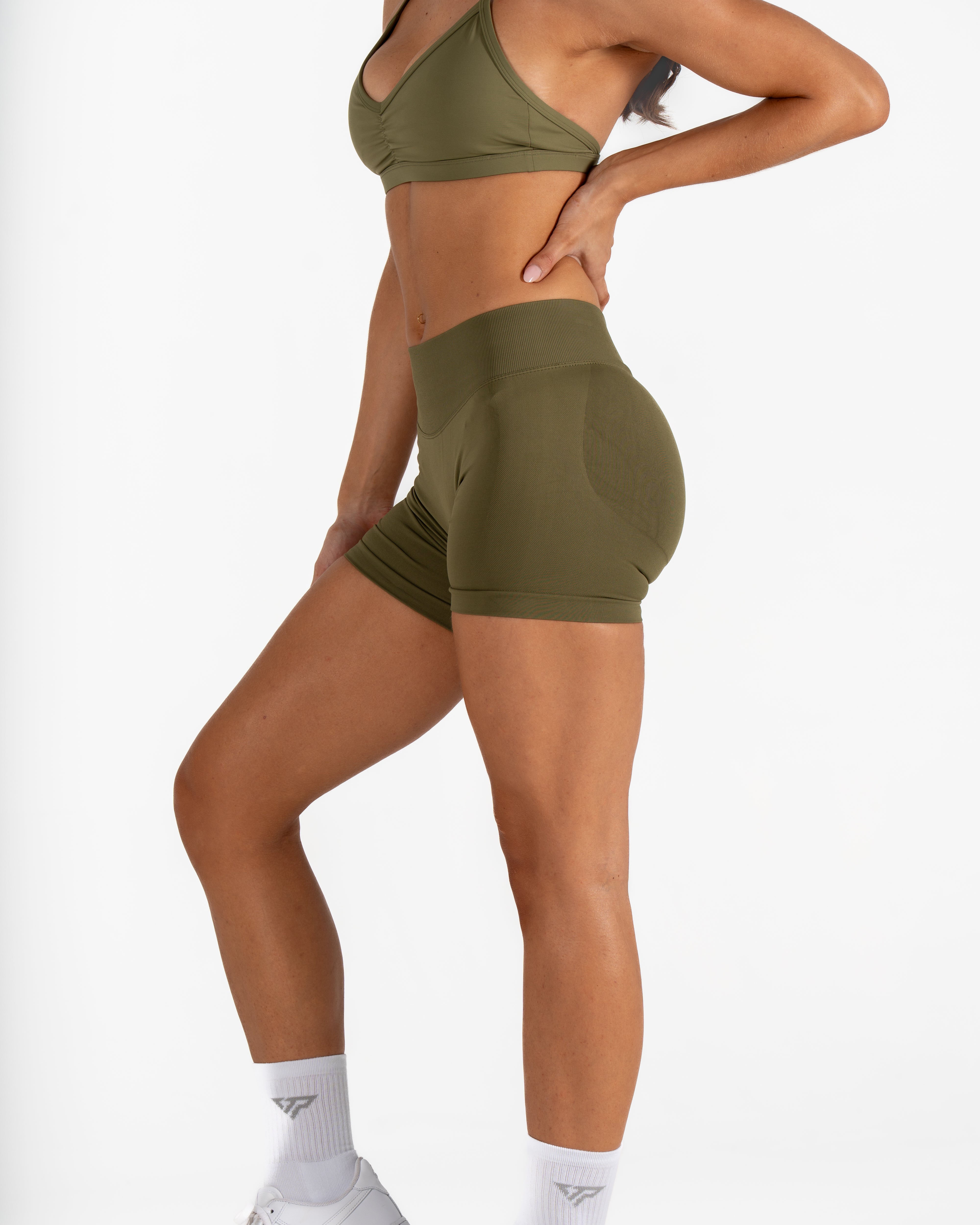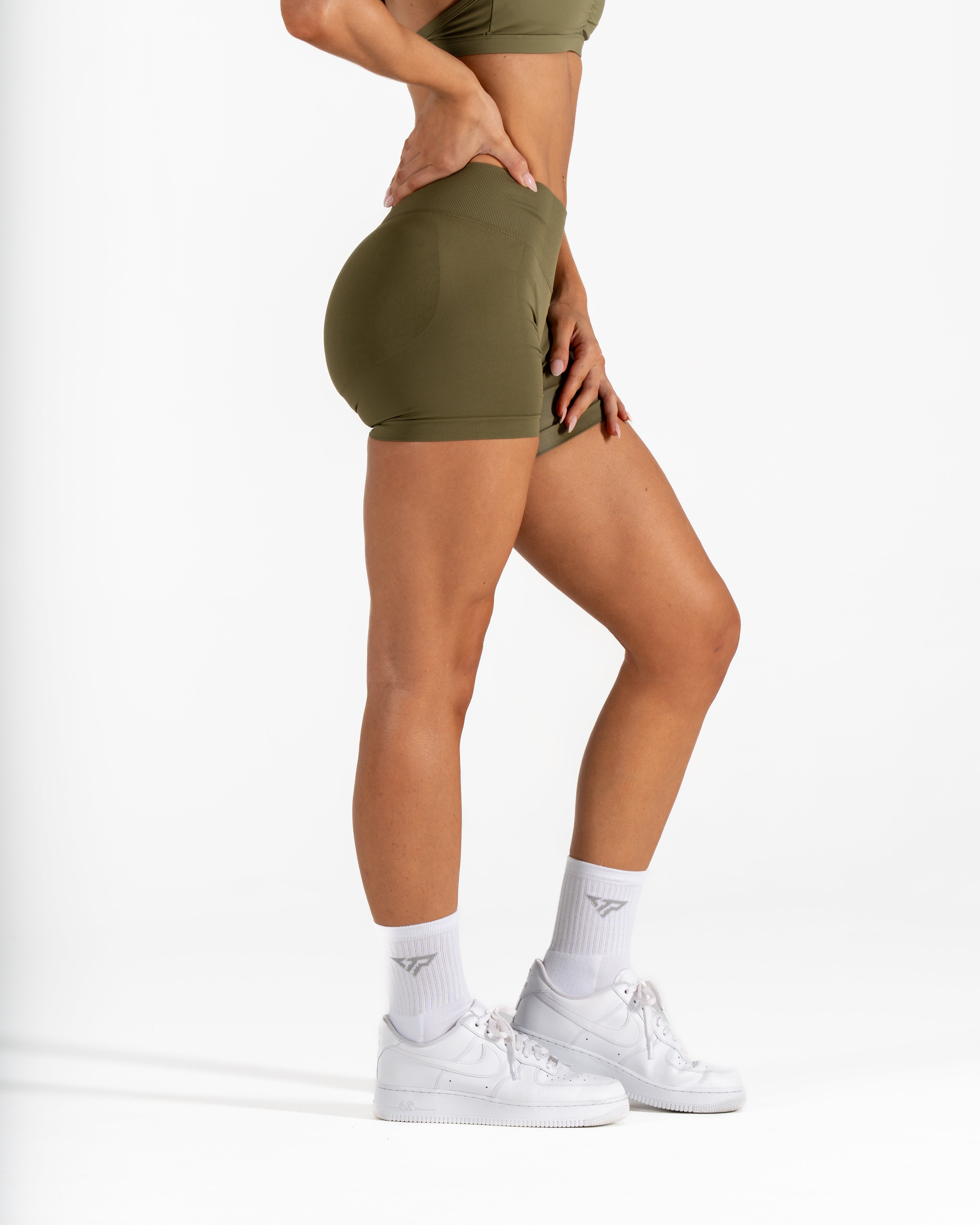 RECOIL HIGH WAIST SCRUNCH SHORTS - DARK KHAKI GREEN